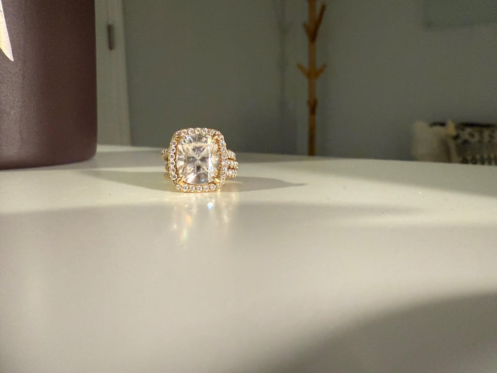 Expertly crafted, the Drenched Oval Cut Morganite Ring showcases a stunning peachy pink morganite in an oval cut. The sparkling diamond halo and band add a touch of luxury, while the comfort fit band and drenched basket provide durability and a secure fit. Made with all natural diamonds, this ring is a timeless and elegant choice for any engagement.