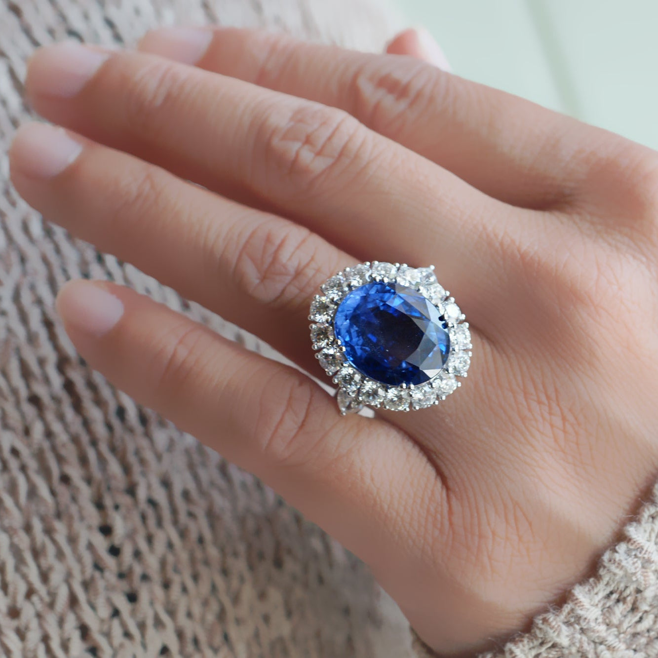 Oval shape blue sapphire ring with diamond halo in white goldOval shape blue sapphire ring with diamond halo in white gold