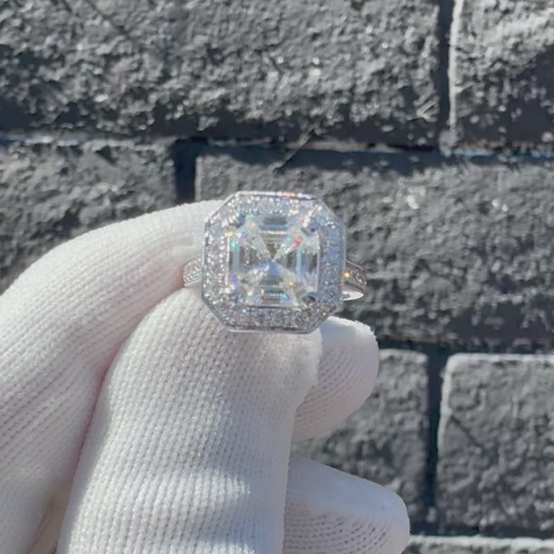 Adore every angle of the Aretha Halo Asscher Moissanite engagement ring: a timeless silhouette given a modern edge with diamond accents, a hexagon shape halo, and vintage filigree. Enjoy the cathedral setting with thick, bold lines - an unforgettable symbol of your love. One wedding band is included.