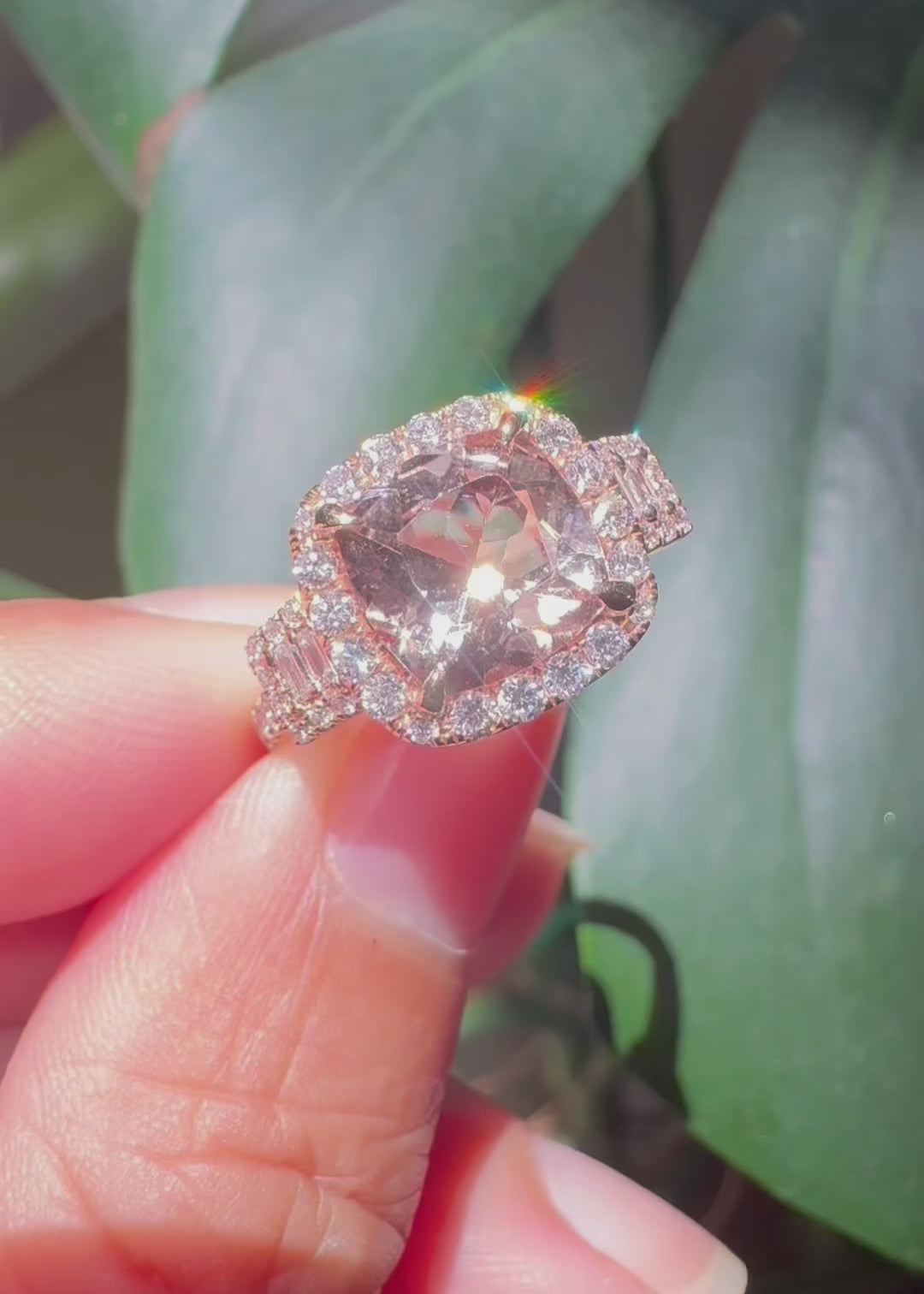 Experience the luxurious beauty of our Cali Cushion Morganite Ring. With a stunning 8x8mm square cushion morganite center stone surrounded by a dazzling diamond halo and three stone diamond design, this rose gold engagement ring is the perfect symbol of your eternal love. Elevate any occasion with this elegant and timeless piece.