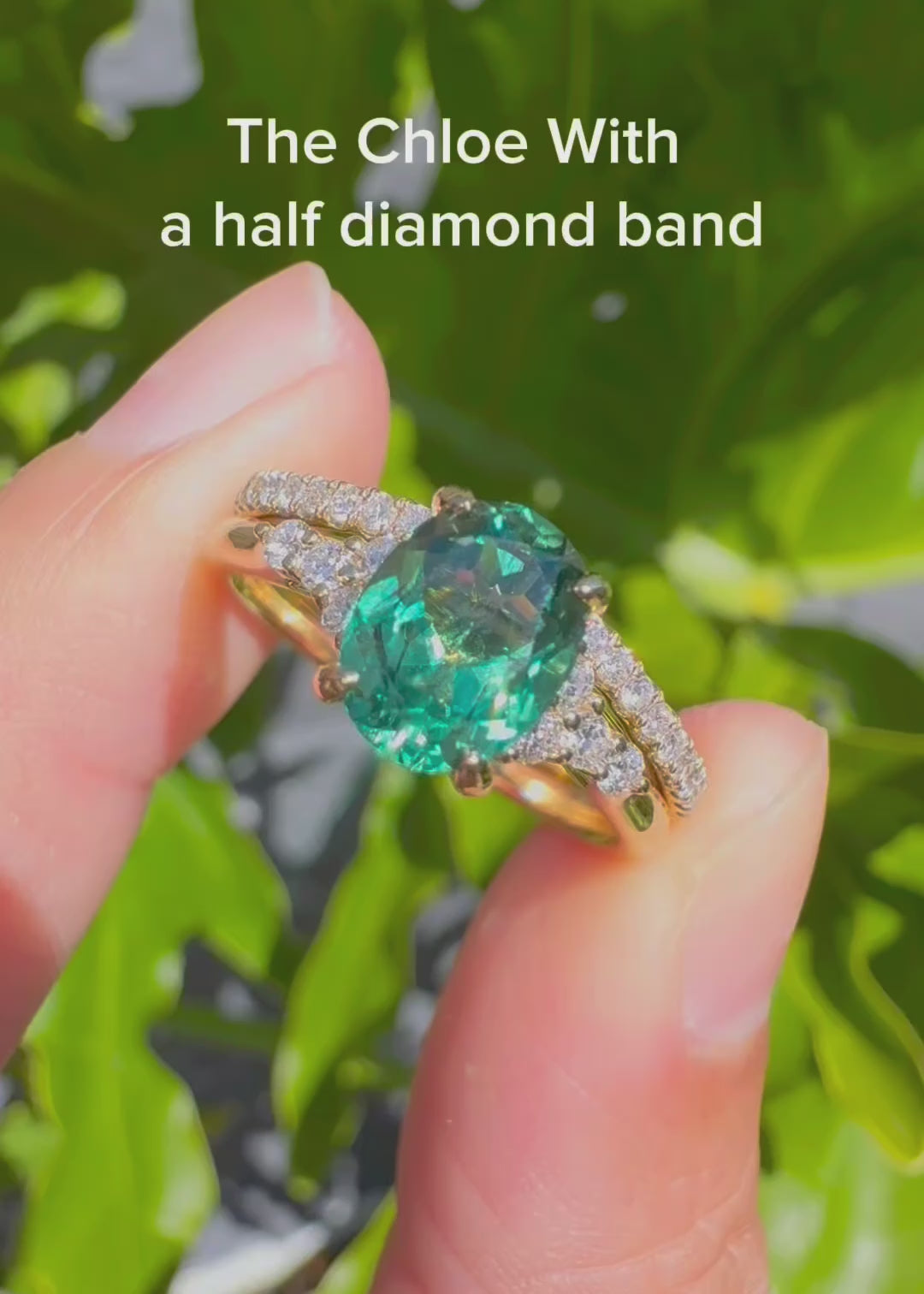 The Chloe oval green sapphire ring features a timeless design and classic style, making it the perfect choice for any occasion. The oval shaped lab grown green sapphire is surrounded by a halo of accent diamonds, in a cathedral setting and rounded band. It is the classic symbol of eternal love and commitment.