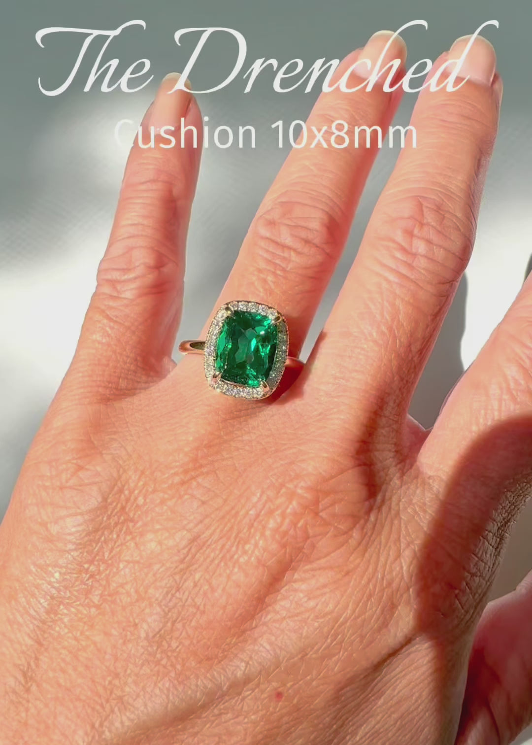 Make a statement with The Drenched Cushion Cut Emerald Ring. This emerald engagement ring features a stunning cushion cut center stone, surrounded by a glimmering diamond halo and band. The unique "drenched" setting adds a touch of adventure to this bold and empowering piece. Own the spotlight with this one-of-a-kind ring.
