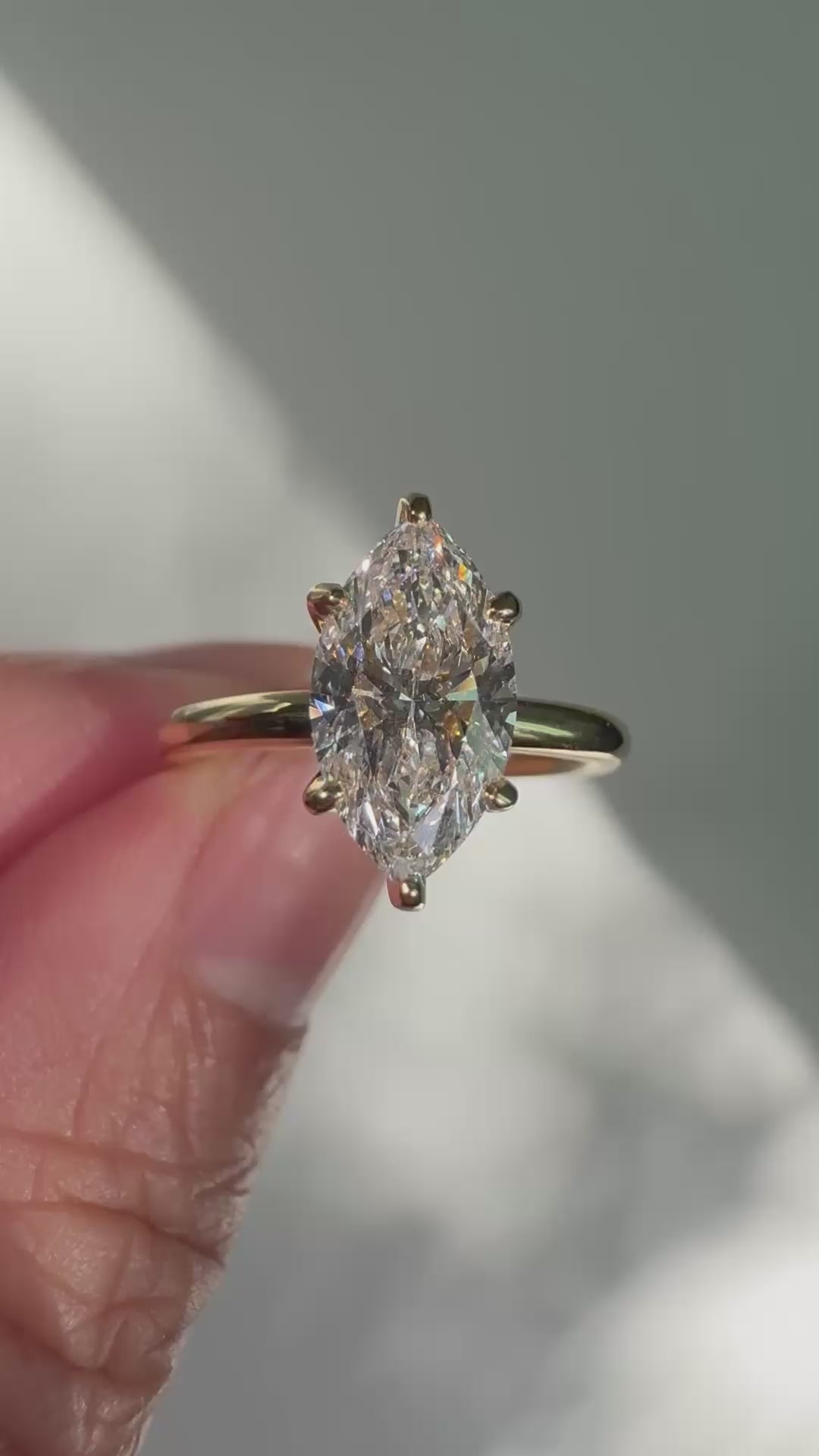 Introducing the Lucy Marquise Cut Diamond Ring, featuring a breathtaking 1.59 carat marquise cut diamond as the center stone E color and IF clarity. Its six prong setting ensures security and the diamond hidden halo adds an extra touch of elegance. The rounded and comfort fit band make it both stylish and comfortable to wear.