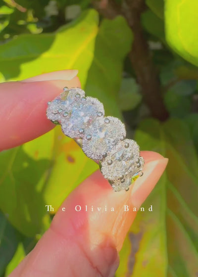 The Olivia band is an all occasion fits all ring, five perfectly matched diamonds are set in dazzling pavé-set diamond halos. She is a great addition to most solitaire engagement ring, and she is very popular as anniversary band.