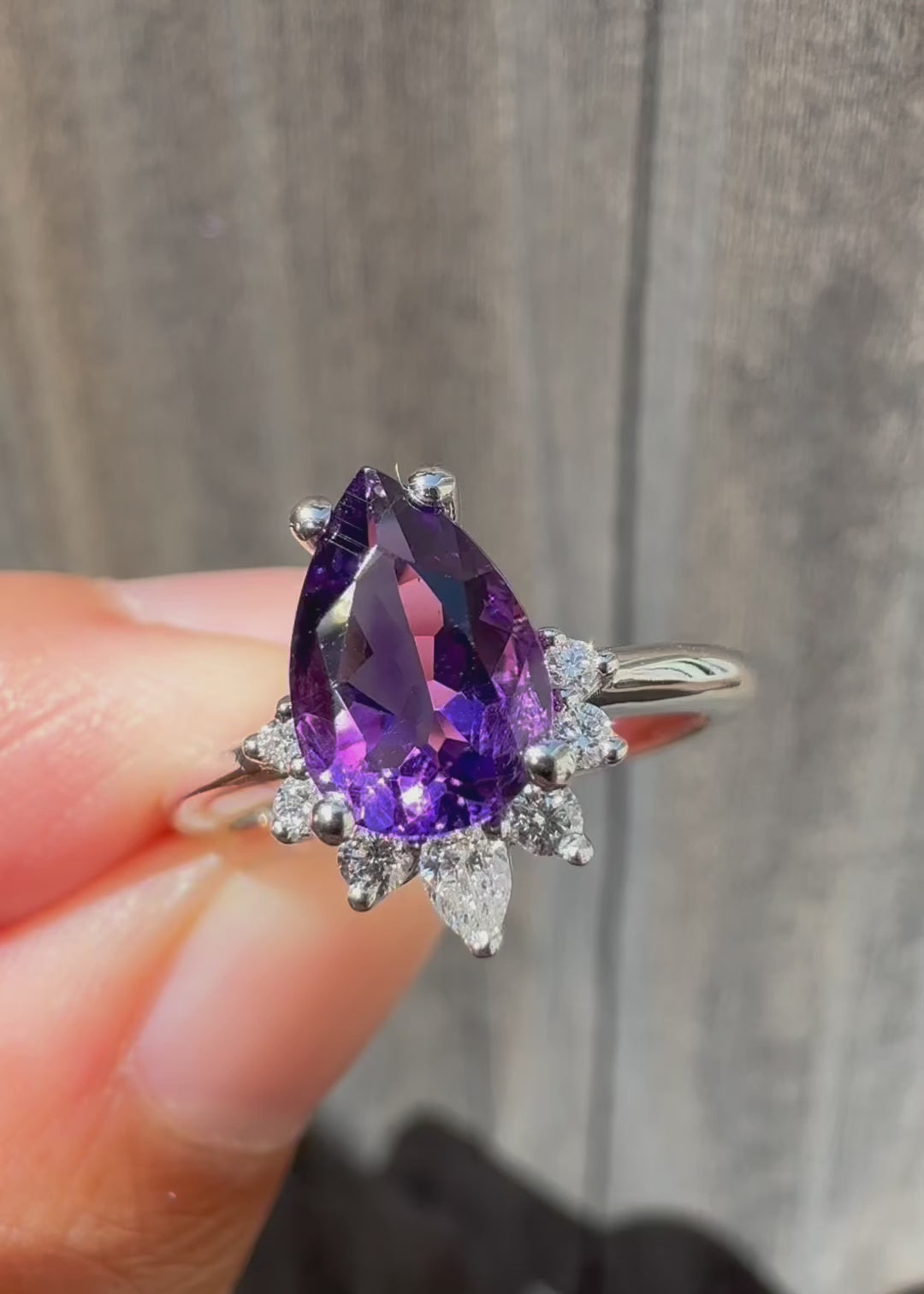 The Pacey ring features prong-set half diamond halo, a diamond crown accented with a middle pear shape diamond. The center gem a purple amethyst is an eye catching contrast. This engagement ring will allow your matching band (sold separately) to sit flush.