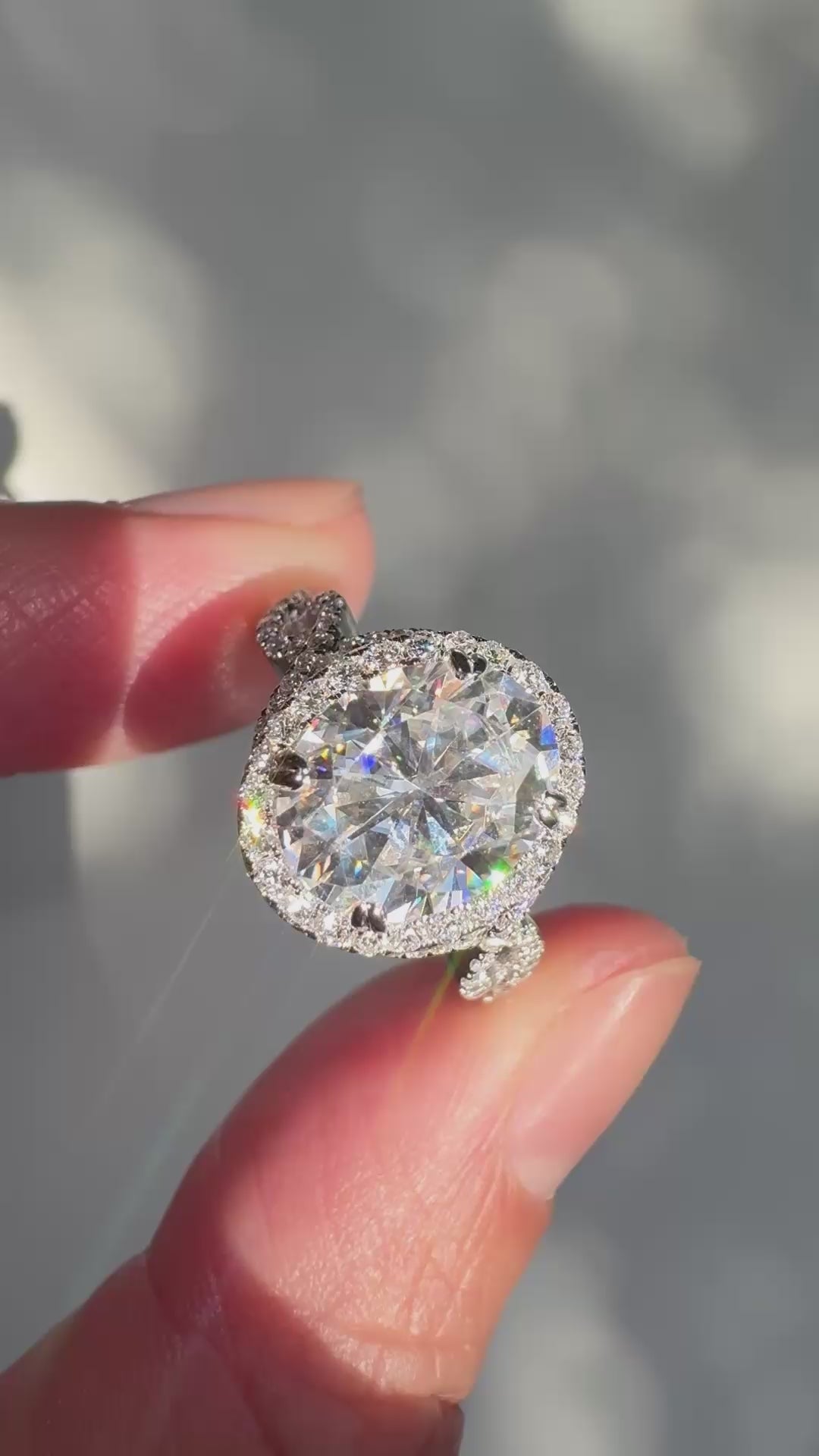 The Shelly ring features pavé-set diamond halo in twist shank setting. Accenting the center gem with diamonds half way down the band. Her main gem is a colorless moissanite set in a four prong setting.