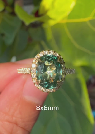This chic diamond halo engagement ring features a lab-grown green sapphire encircled with brilliant diamonds in a cathedral setting. The ornate basket and diamond band amplifies the beauty of this oval ring, making it the perfect token of love.